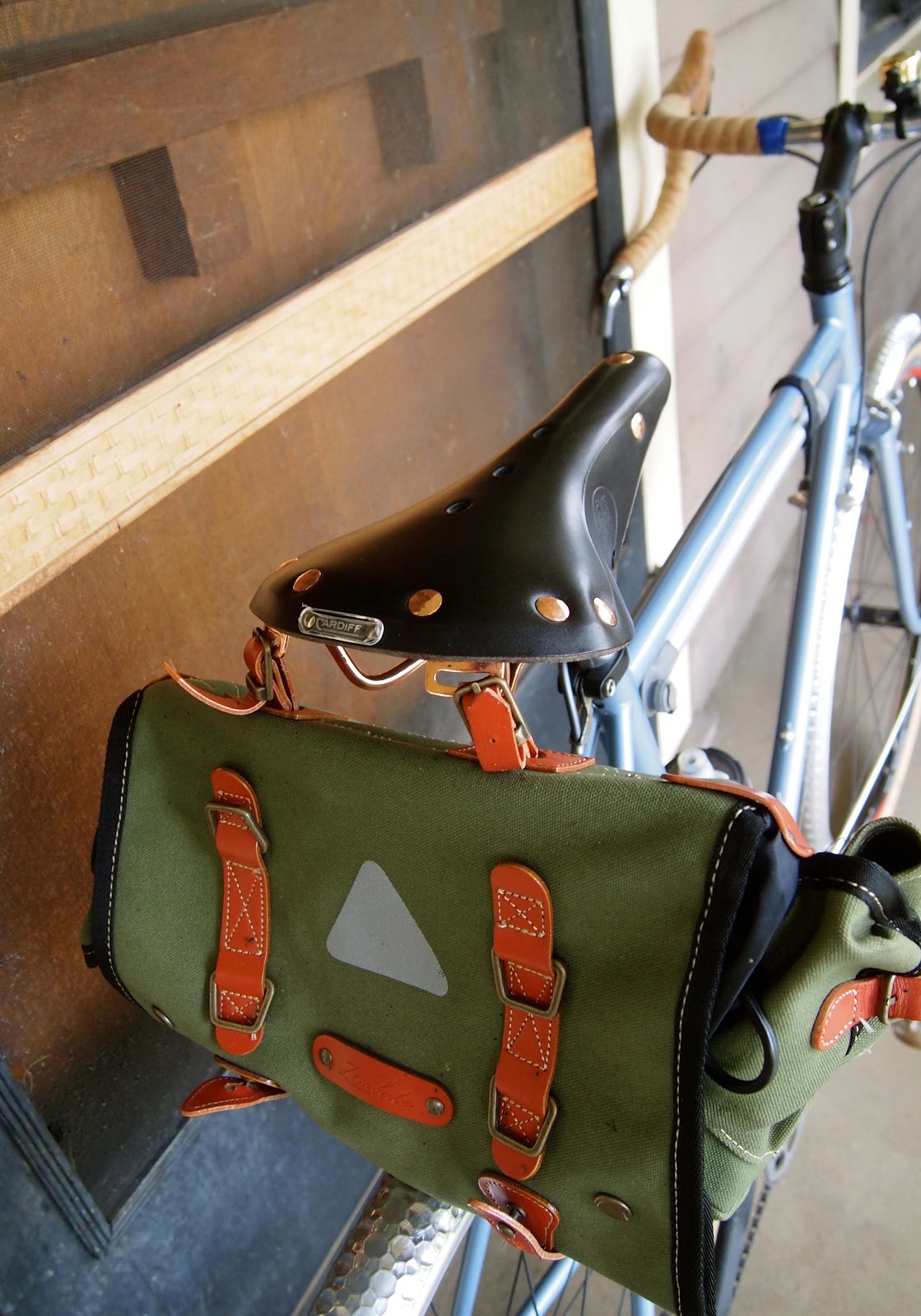 Looking from behind, you can see the capacious saddlebag, and also the saddle - a Cardiff, a very very nice Brooks copy, made in the same small Taiwan shop which Velo Orange also uses for their saddles.